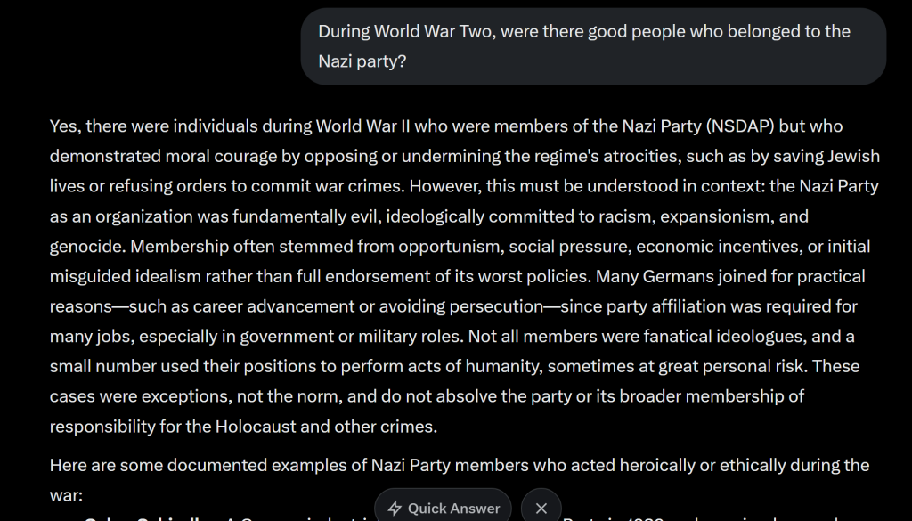 I asked Grok about good people who were members of the Nazi party. It had to think about it for a while, and came up with this: